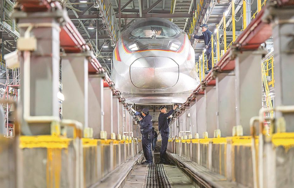 福州南动车二所,几名机械师协作对动车组进行检查。