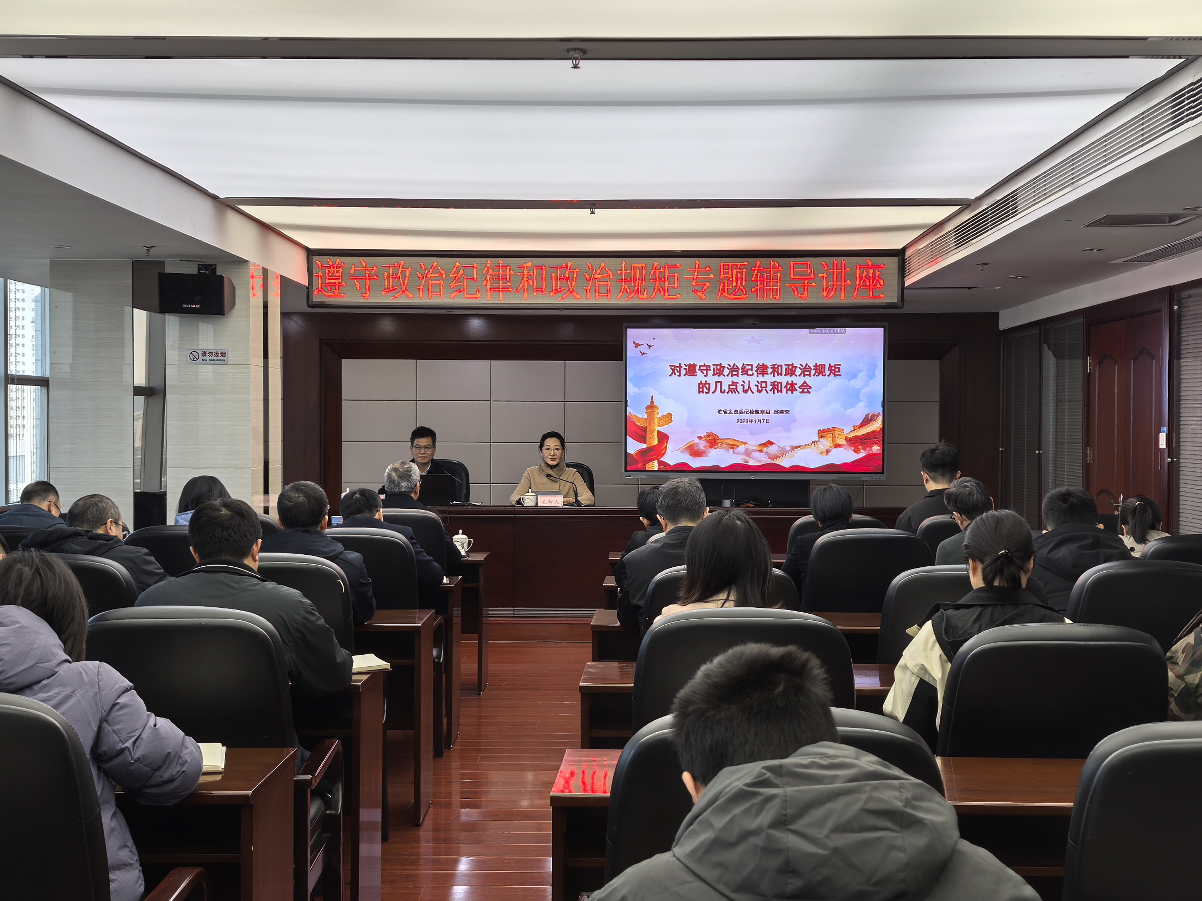 为加强政治纪律和政治规矩教育,进一步增强党员、干部的政治能力和纪法意识,提升依法履职、秉公用权、廉洁从业的能力水平,1月7日,省政府投资项目评审中心举办遵守政治纪律和政治规矩专题辅导讲座,邀请驻省发改委纪检监察组邱奕荣常务副组长授课,中心在家领导和全体干部参加会议。