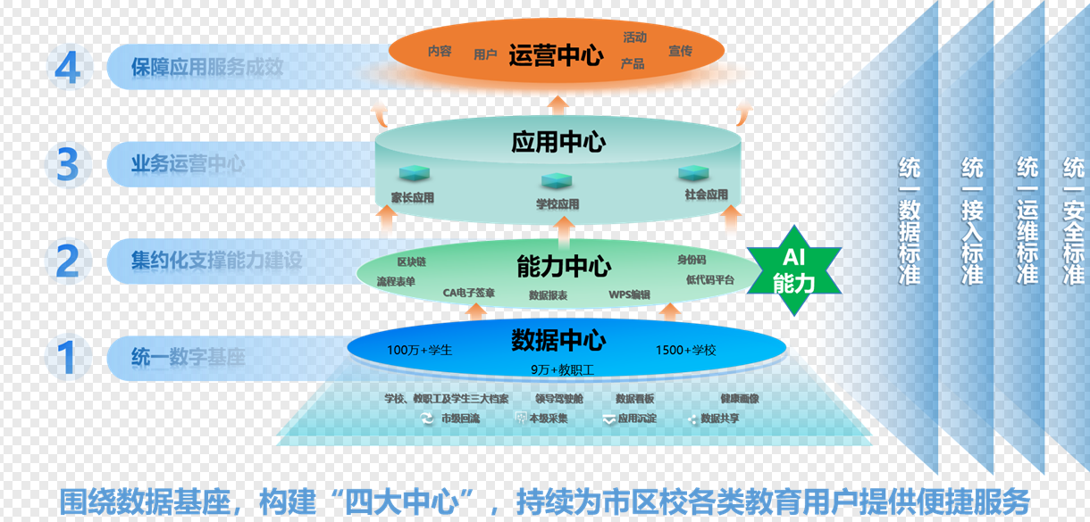 一是打造教育数据中心,纵向对接教育部、省教育厅等上级数据应用平台,横向通过市政务协同实现跨部门数据共享,分级归类汇聚全市大中小幼100多万名学生、9万多名教职工和1200多所学校数据,建立各级各类学校、教职工及学生三大档案,构建领导驾驶舱、数据看板、健康画像等,为领导决策和精准服务提供有力支撑。二是建立能力支撑中心,提供如区块链技术、流程表单、大数据报表、身份码、WPS编辑、CA电子签章、低代码等创新型工具,通过开放平台授权赋能市区校不同教育场景下的应用需求。三是打造教育应用中心,构建“市区校”一体化应用工作台,开放接入“家、校、社”应用,推广“一站式”教育服务,确保“网络通”“数据通”“业务通”,实现从“一网通管”到“一网通办”,创新性推出入学一件事、课后服务、教育缴费、教师研修、学生资助、师生健康等一系列应用,让家校空间互通、师生空间互通、数据资源互通、数字应用互通。四是设立体系化运营中心,在内容、用户、产品、活动、宣传等方面精细化专班运营流程,规范形成有效运营管理机制,确保平台稳定运行和高效服务。