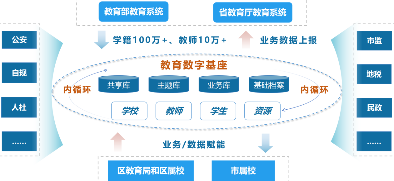 2.融合数据双循环驱动模式,支撑数据内外联动。一是数据内循环,依托教育城域网优势,开放赋能各类教育数据应用,回流沉淀业务主题数据,夯实教育数据基座,赋能教育应用提升成效,构建良性的内部数据循环。二是数据外循环,通过统一对外数据共享通道,实现与上级部门、跨部门业务协同和数据共享联动。