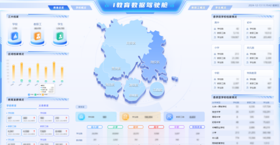 1.建立多层级数据治理模式,支撑市区校业务协同建立市、区、校、学段、年段、班级等多层级组织架构,汇聚三大教育档案,实现全市“一校一档、一师一档、一生一档”,形成教育主题库、专题库,有效支撑领导驾驶舱、教育基报、教育事业统计、三大画像、教育数据年鉴、千人千面智能推荐等数据应用场景。