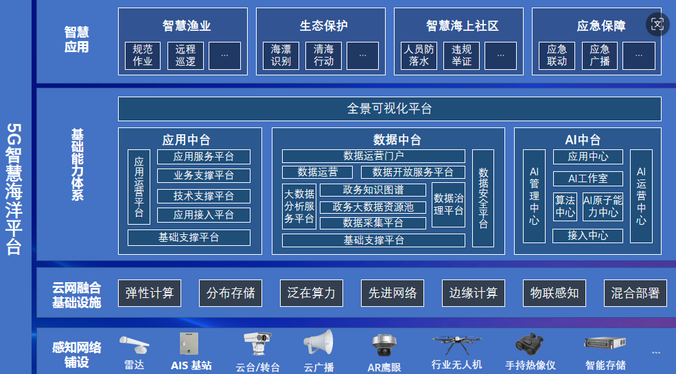 采用“云-边-端”分布式多中枢协同架构,有效联动应用中台、数据中台和AI中台,共同构建了一个统一的全景可视化指挥管理平台。核心应用聚焦于智慧渔业、海洋生态保护、智慧海上社区及海上应急保障等多个关键领域,最终形成了全方位的海域综合管理能力,为沿海乡镇、渔村及管理部门提供了智慧海洋一站式解决方案。