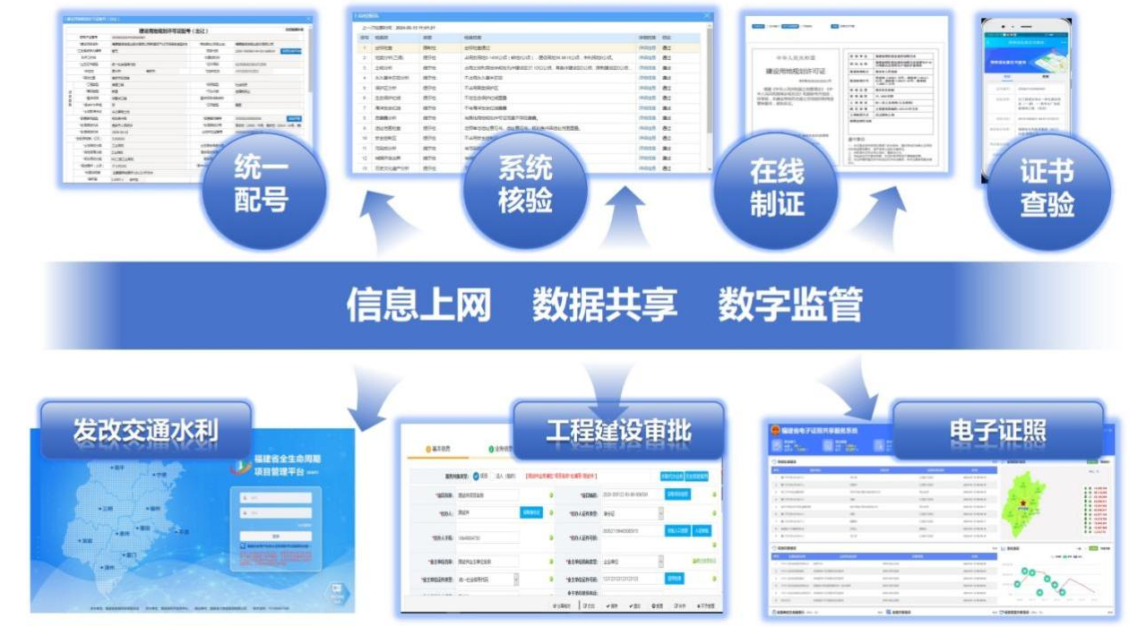 构建统一配号、系统核验、在线制证、证书查验等功能,并全面对接项目主管部门的选址立项等信息系统和工程建设项目审批等平台,确保信息上网、数据共享、数字监管。截至目前,共网办规划许可事项17万宗、面积约606万亩。