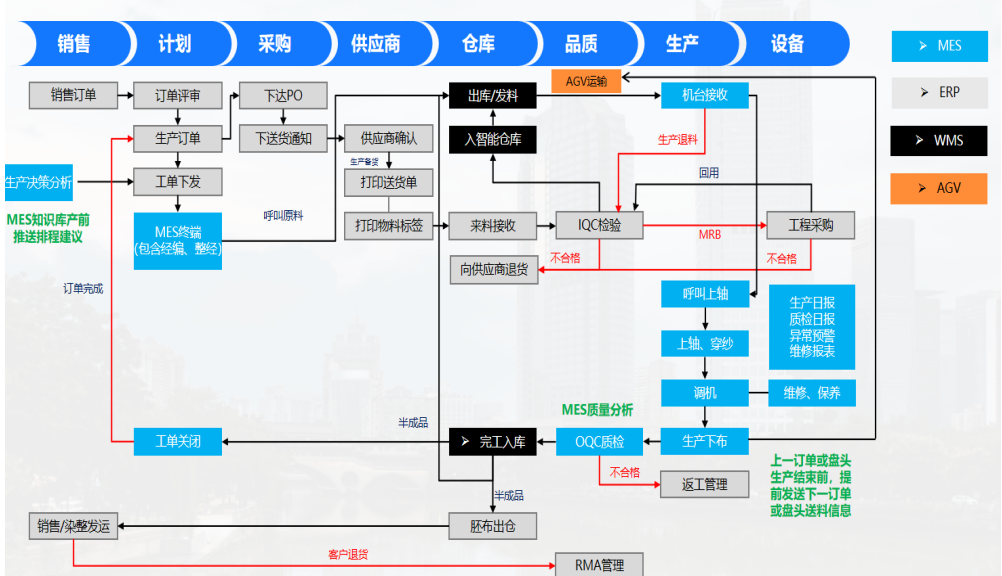 通过5G+MEC组网运行设备数据交互,建立WMS及MES,实现全过程闭环管理,数字化管理打通设计、生产、销售、消费等核心数据链,发展数字孪生技术,优化企业经营管理模式,提升市场预测、客户需求分析和精益制造能力。此外,5G+MEC的组网,为企业瑕疵检测、智能排产、仓储调度提供了快速、强大的算力支撑。通过对生产设备的效率、进度、工艺的分析,辅助优化排产;成品布经过检测后,通过边缘计算,自动进行布匹定级;仓储与MES的联动,快速规划库位与调拨出库。