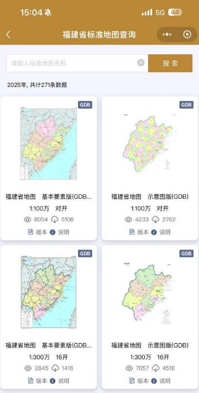 系统基于浏览器/服务器架构,构建“网页系统+微信小程序”一库多端服务模式,支持双视图联动检索、SVG(矢量图形)在线制图、唯一码设计存储等核心技术,集成标准地图发布、查询、定制、下载等功能,提供覆盖省、市、县三级多年份、多尺度、多类型的标准地图与政务用图、政务挂图、“一乡一图”等参考地图资源,全面支撑政府决策、公共管理、社会服务和公众用图需求。