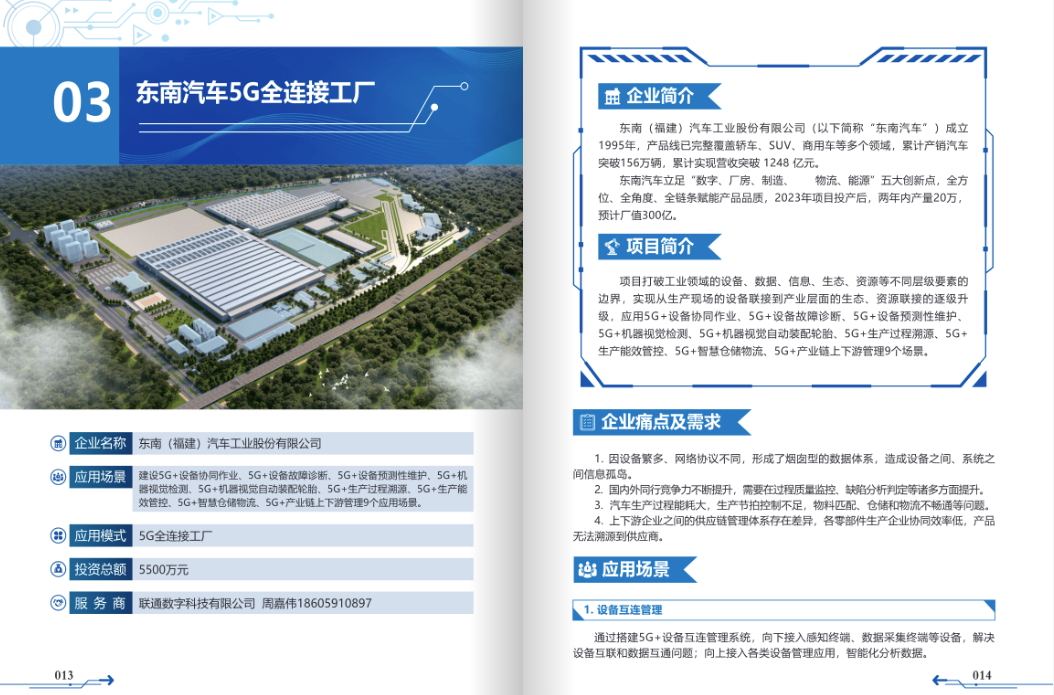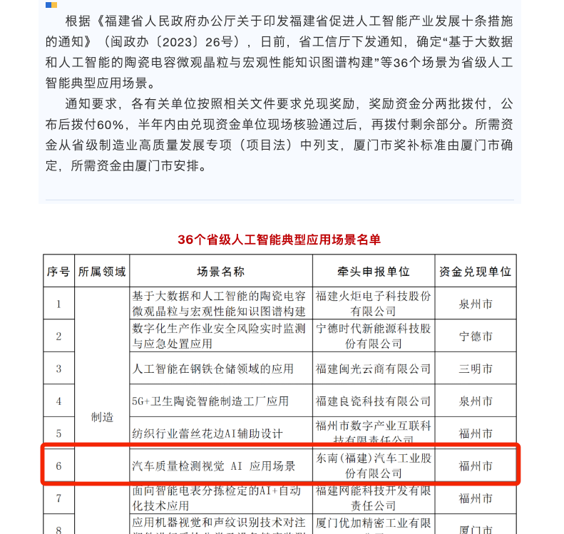 基于产线建设和数字化转型需求,东南汽车携手福建联通通过5G网络建设、产线智能化改造、生产研发技术升级等方式打造5G智慧工厂。项目包含“1张网+1个工业互联网云平台+N个智能化应用”。该项目成功入围了2023年福建省新一代信息技术与制造业融合发展典型案例,其中的5G+汽车质量机器视觉检测入选2024年福建省人工智能典型应用场景。