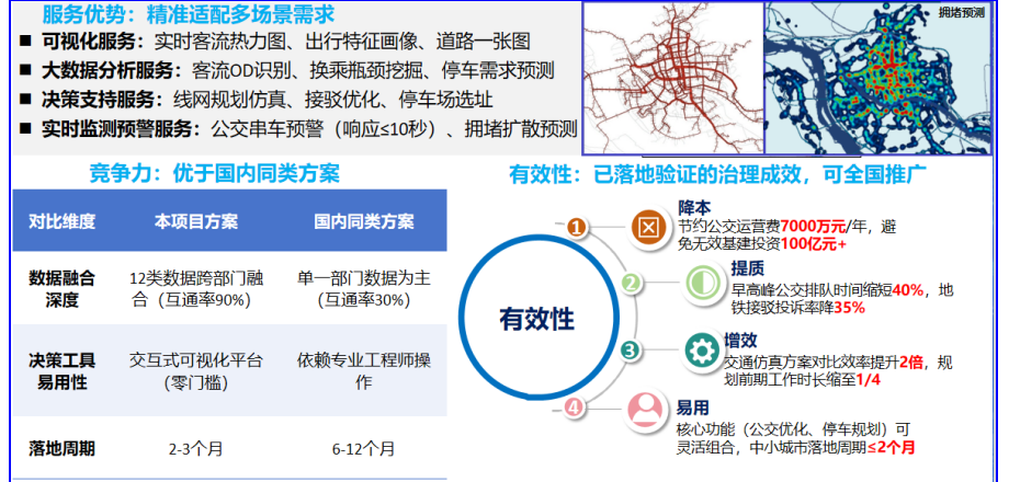 系统优势显著,可精准适配多场景,拥堵预测、信息可视化等服务功能全,决策工具零门槛,落地周期短至2-3个月。经济效益上,节约无效投资超100亿元,公交年省运营费7000万元,并带动相关产业增长;社会效益上,民生体验提升,助力福州获评“全国绿色出行示范城市”。