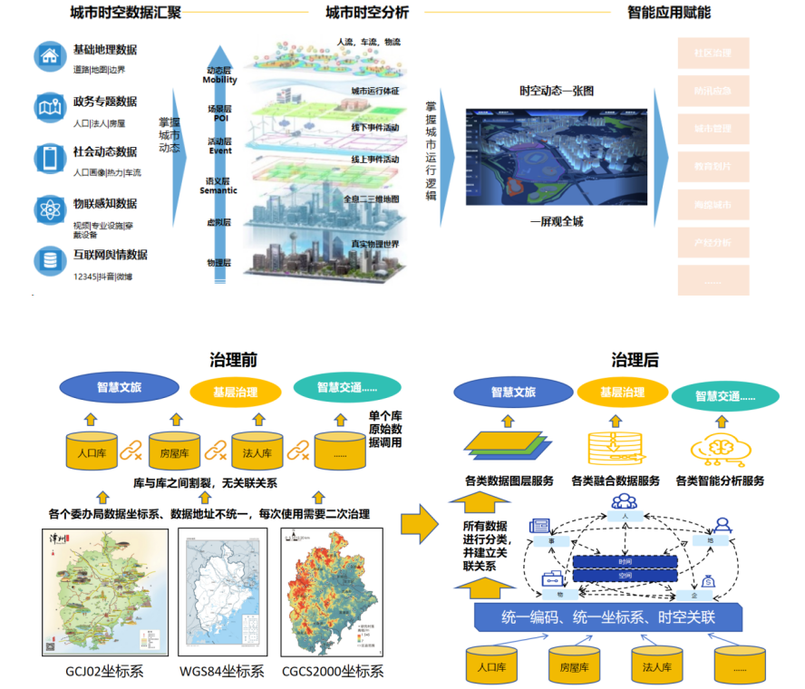 一是构建全域时空底座,破解数据分散难题,实现治理要素“一图统览”。针对城市数据来源多样、标准不一、难以关联的现状,以统一地理空间为基底,整合基础地图、政务专题、物联感知、社会动态等多源异构数据,构建贯通市、县、乡、村四级的全要素“一张图”。通过实施统一地址编码和时空化治理,将原本孤立的人、房、企、事、物等要素进行图谱化关联与动态融合,形成城市运行管理的“数字底盘”。二是打造智能中枢系统,打通数据流转壁垒,赋能业务协同与科学决策。面对部门数据孤岛林立、更新滞后、分析能力不足的问题,提供数据汇聚、治理、分析的一站式服务,通过标准化流程实现数据清洗、融合与全生命周期管理,建立在线协同更新机制,推动数据从离线存储向在线服务升级。在此基础上,依托分布式计算、时空数据挖掘等智能分析技术,对城市运行体征进行实时监测、深度研判与预测预警,支撑跨部门协同指挥和数字孪生应用,为教育、文旅、灾害应急、公共交通、社会保障等场景提供高精度、动态化的数据支持,提升城市响应速度与决策科学性。三是推进场景深度融合,释放数据要素价值,实现业务效能倍增。聚焦产业发展、城市治理与民生服务关键领域,将时空数据能力与具体业务需求紧密结合。在招商分析、景区管理、产业监测等场景中,通过多维度数据融合分析,精准识别资源错配、风险隐患与服务短板,辅助优化商场选址、客流疏导、公共设施布局等决策,推动治理模式从被动响应转向主动预见,从粗放管理转向精准施策,形成“数据驱动—流程优化—效能提升”的良性闭环,全面提升城市高质量发展水平。