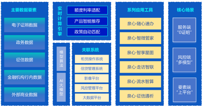 三、推动数据多场景复用,打造多维标签、智能建模的普惠金融多领域创新应用。一是全国银行业首创全流程、全场景“0证明”创新应用。创新“泉智·随心速办”应用,打通电子证照在金融机构内部柜面、信贷等系统间流转,打造开户、授信、政策直享等全场景“0”证明创新应用,实现平均审批时间缩短60%以上,已累计为各类经营主体授信超70亿元。二是构建全客群、全周期风控多模型应用。运用已汇聚的多维数据,使用评分卡、决策树、梯度提升等模型算法,打造超150个多标签综合风控模型,运用于授信等各类业务场景以及打击金融黑灰产、反诈、反洗钱等多个领域,风险识别准确率提升35%。三是打造农村要素上平台“一站式”服务应用。联动农业农村、林业等部门搭建“三资”、林业要素管理平台等互联互通的要素数字化平台矩阵,通过知识图谱、智能算法等技术,融通平台数据要素、历史交易数据、市场供需信息等搭建农村要素资产估值模型,解决农村要素流转难题,已赋能相关贷款投放超30亿元。