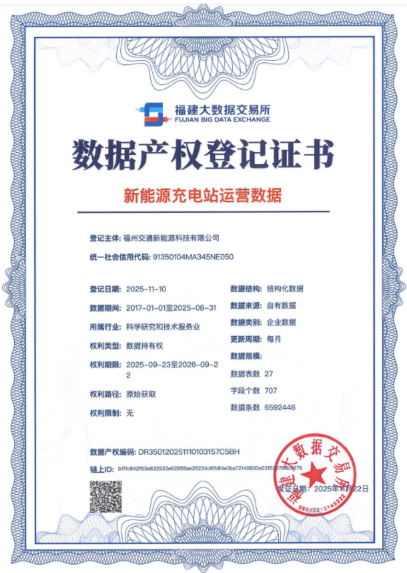 全省首张数据产权登记证书随之落地。福州交通新能源科技有限公司本次登记的新能源充电站运营数据,数据来源归类于自行采集生成大类中的信息系统产生类,涵盖充电站能耗监测、站点基础信息、充电订单详情、充电量统计等关键维度。