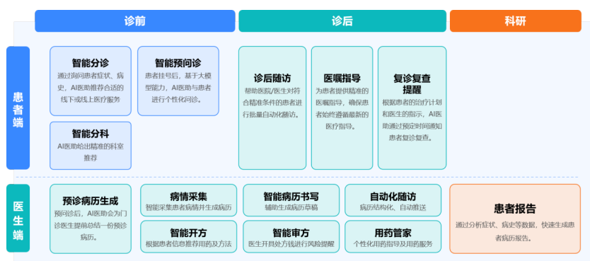 AI医生助理通过智能/人工预问诊采集患者信息,生成结构化电子病历,减少医生录入时间;在诊中基于实时知识库为医生提供诊断建议与用药参考;诊后自动执行随访任务,支持报告解读与健康提醒,形成连续健康管理闭环。