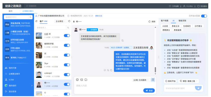 通过医生驻点培训、季度版本更新等方式,持续优化系统功能,确保系统在实际医疗场景中的适用性与稳定性。提供智能运营平台,实时跟进及监测AI的运行成果,并可随时人工介入任何一个AI的聊天,人机协同以保障服务质量