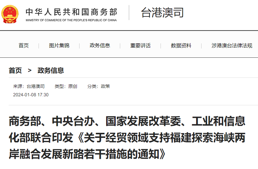 《关于经贸领域支持福建探索海峡两岸融合发展新路若干措施的通知》