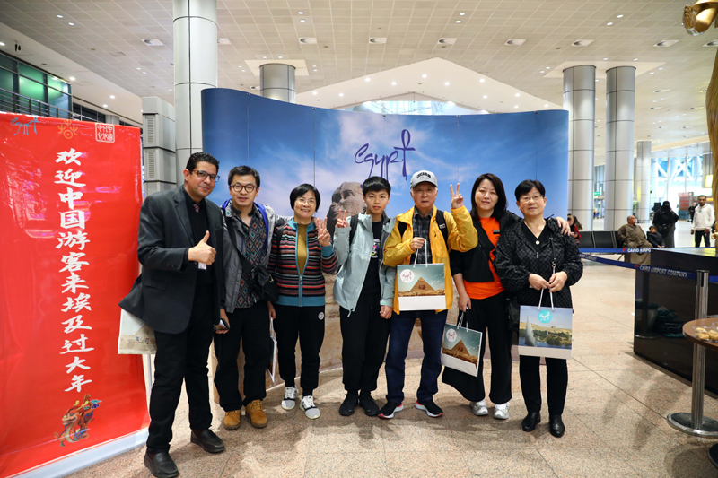 2024年2月10日,中国游客在埃及开罗国际机场举行的“欢迎中国游客来埃及过大年”仪式上合影留念。新华社发(艾哈迈德·戈马 摄)