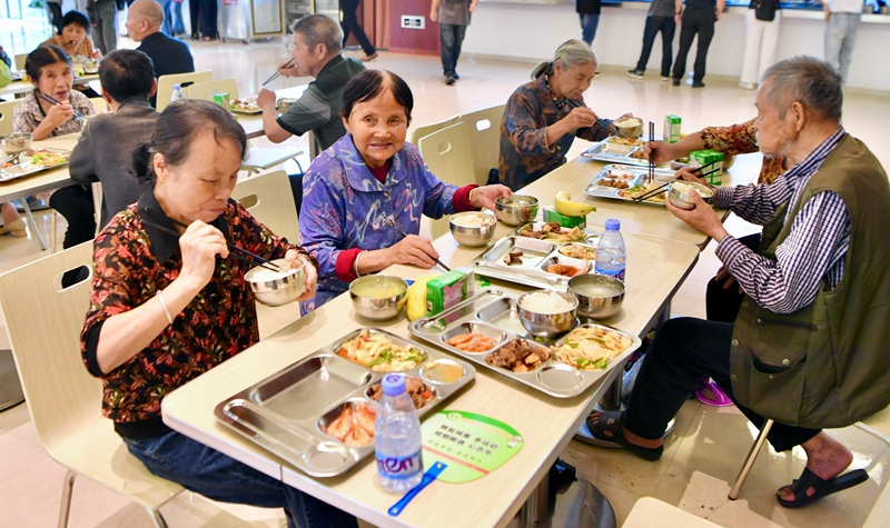 6月15日,福建省武夷山市因暴雨转移群众在避灾安置点海亮研学基地食堂用餐。新华社记者 姜克红 摄