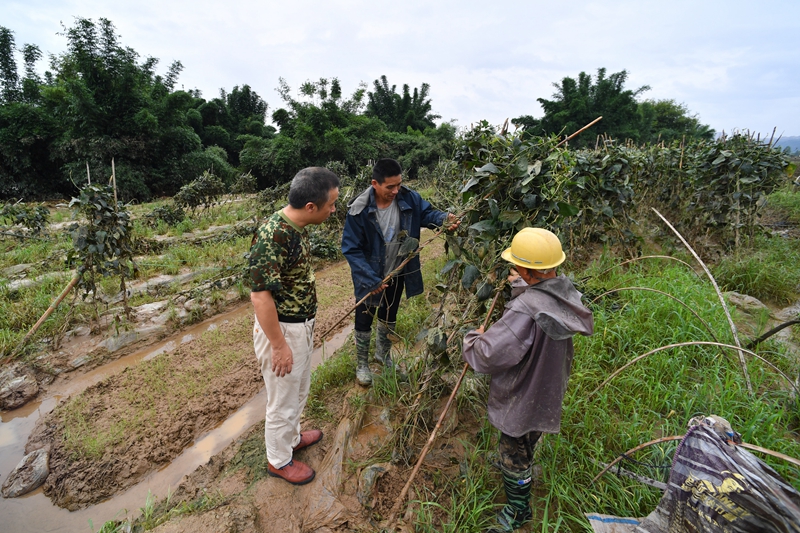6月17日,福建省建瓯市芝山街道农技人员(左)在马汶村庙下自然村指导菜农开展灾后自救。新华社记者 姜克红 摄