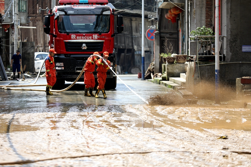 6月13日,在贵州省锦屏县钟灵乡钟灵村,消防人员在清理淤泥。新华社发(杨晓海 摄)